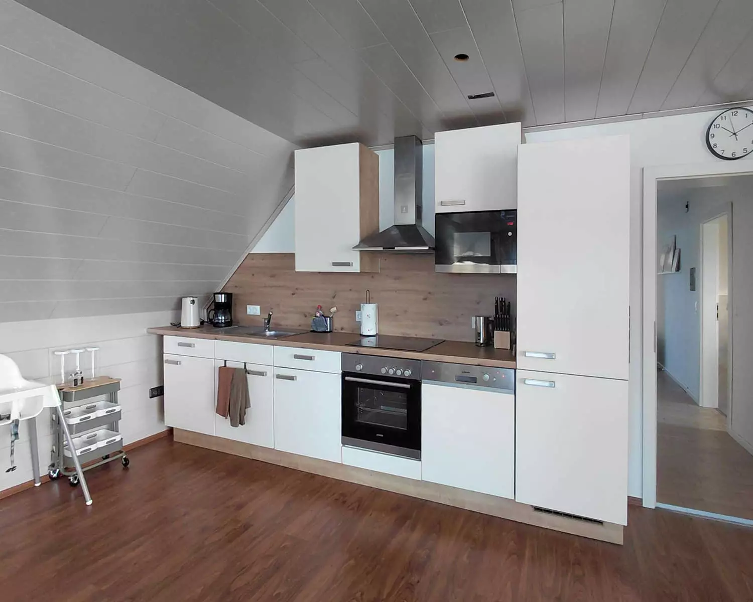Der offene Wohn- und Essbereich mit integrierter Küche lädt zum Verweilen ein und ist komplett ausgestattet.